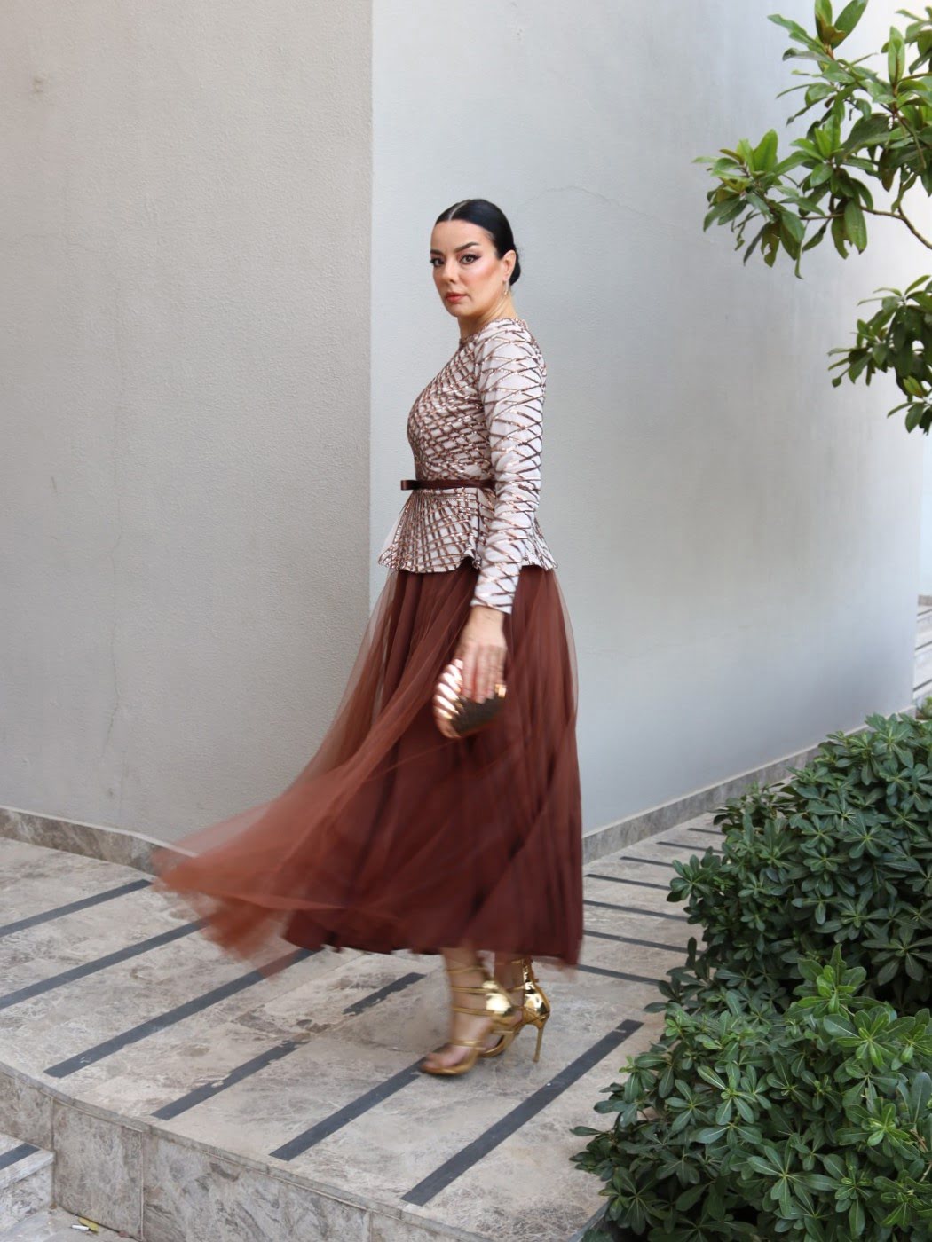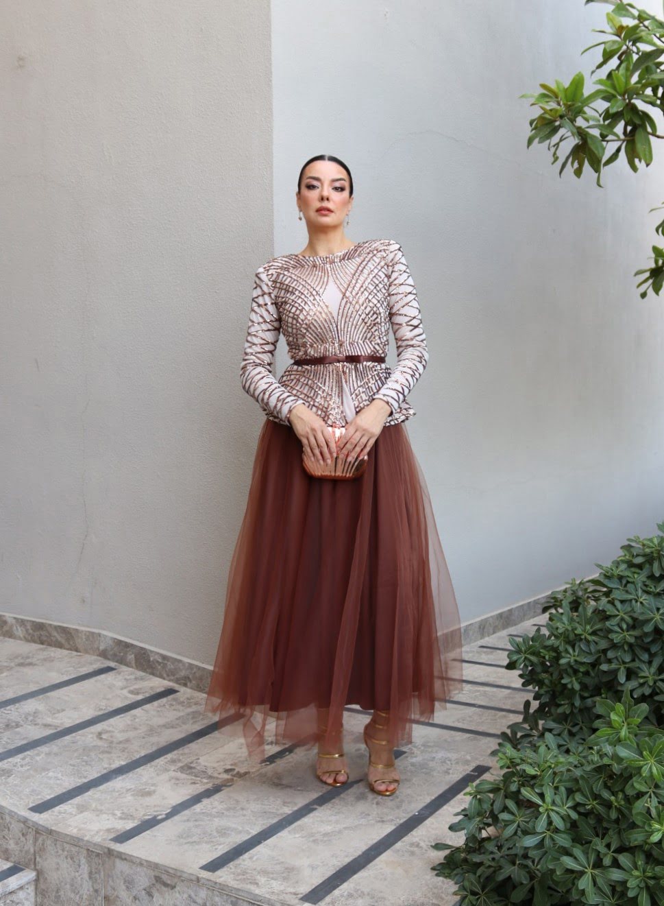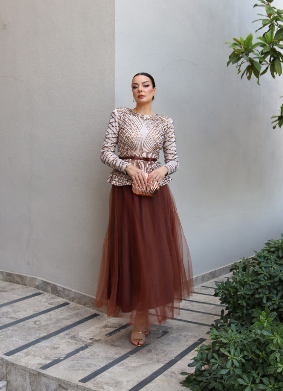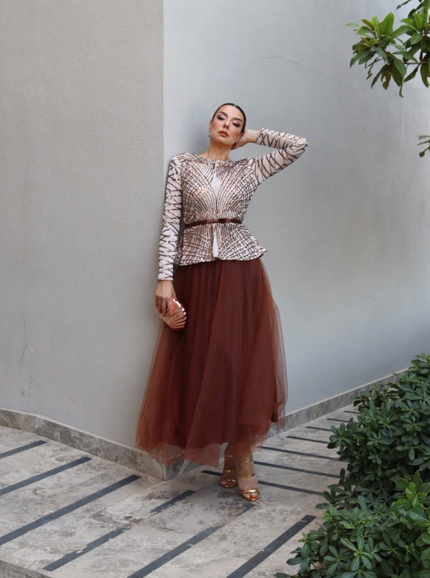 6114 – Peplum Payet Kloş Abiye Elbise Bakır